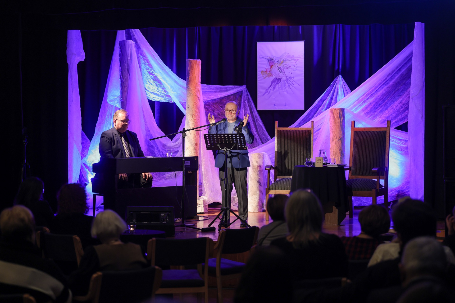 Tło, czyli scenografia wyczarowana przez Andrzeja Śliwickiego, w bieli i niebieskości, dopełnia nastroju tego listopadowego wieczoru. Wszyscy, którzy wychodzą z tomikiem „Koliber”, będą mieli szansę zatrzymać w pamięci te dwie godziny na zawsze.